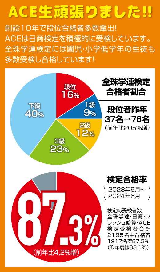 エースは全国三大珠算団体の一つである(公社)全国珠算学校連盟に加盟しております。全教室で文部科学省後援の検定試験(年6回)が受検できます。また、文部科学省後援の「フラッシュ暗算検定試験」を当教室で毎月受検することが可能です!全珠学連・フラッシュ暗算・日商・ACEの4種類の検定試験でお子様の能力・やる気を引き出します!また、競技会・コンクールにも積極的に参加し、全国大会にも出場しています!